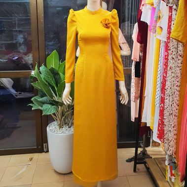 Áo dài cách tân vải lụa màu vàng tay bồng đính hoa mã số PTAD004