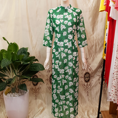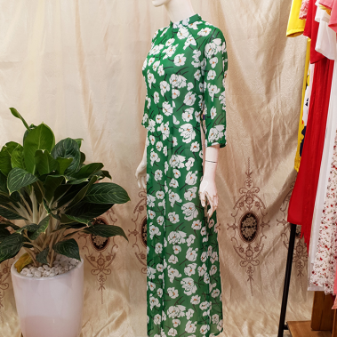 Áo dài vải tơ màu xanh tay lỡ họa tiết hoa trắng mã số PTAD026