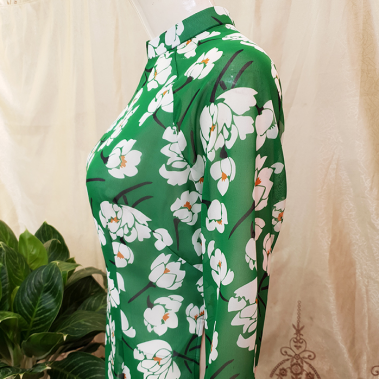 Áo dài vải tơ màu xanh tay lỡ họa tiết hoa trắng mã số PTAD026 Xem ảnh lớn