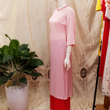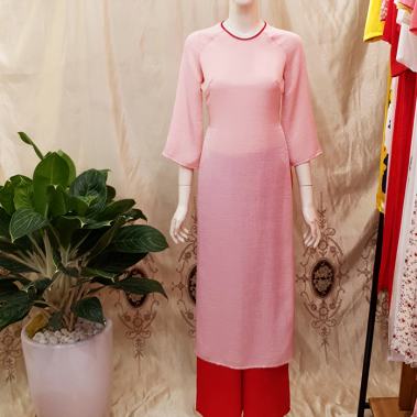 Áo dài hồng viền cổ tròn đỏ tay lỡ mã số PTAD035